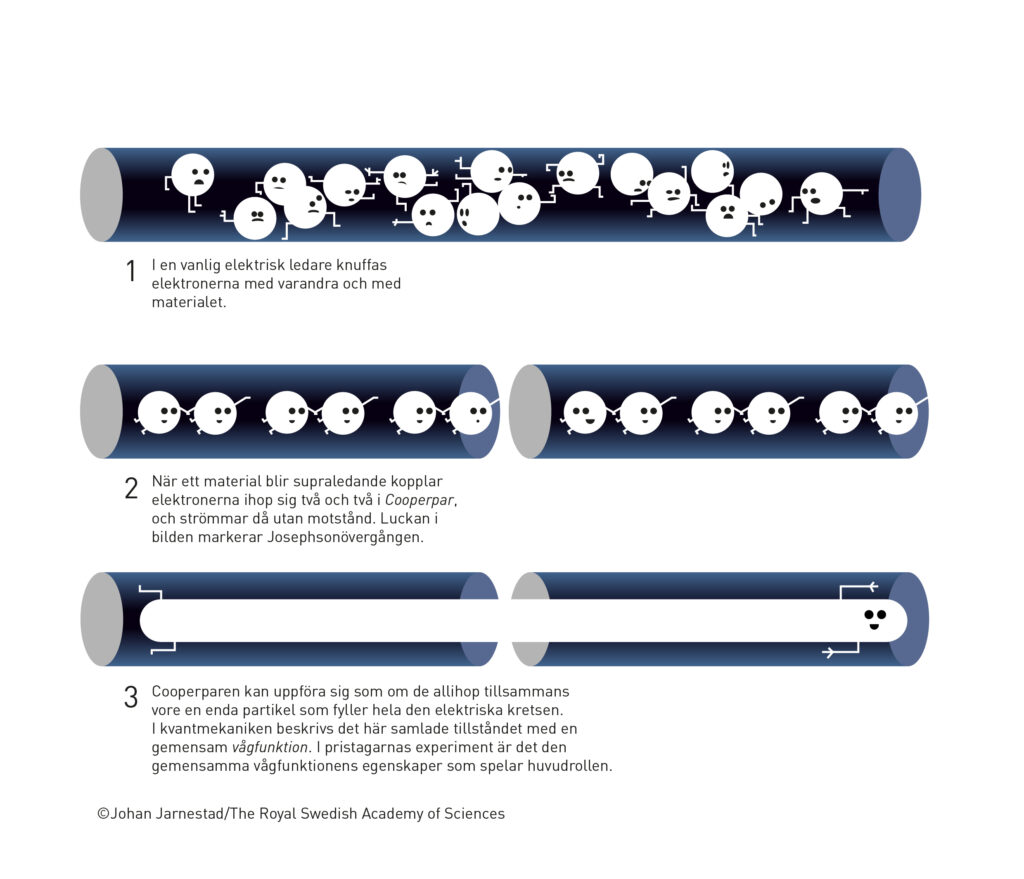 John Clarke, Michel H. Devoret och John M. Martinis genomförde 1984 och 1985 en serie experiment med en elektrisk krets uppbyggd av supraledare, det vill säga komponenter som kan leda ström helt utan elektriskt motstånd. I kretsen separerades de supraledande delarna med ett tunt skikt av ett material som inte leder ström alls, ett arrangemang som kallas Josephsonövergång. Genom att renodla och mäta alla olika egenskaper hos kretsen kunde de styra och utforska de fenomen som uppkom när de ledde en ström genom den. De laddningsbärande partiklarna i supraledaren bildade tillsammans ett gemensamt system och uppförde sig som om de vore en enda partikel som fyllde hela den elektriska kretsen.